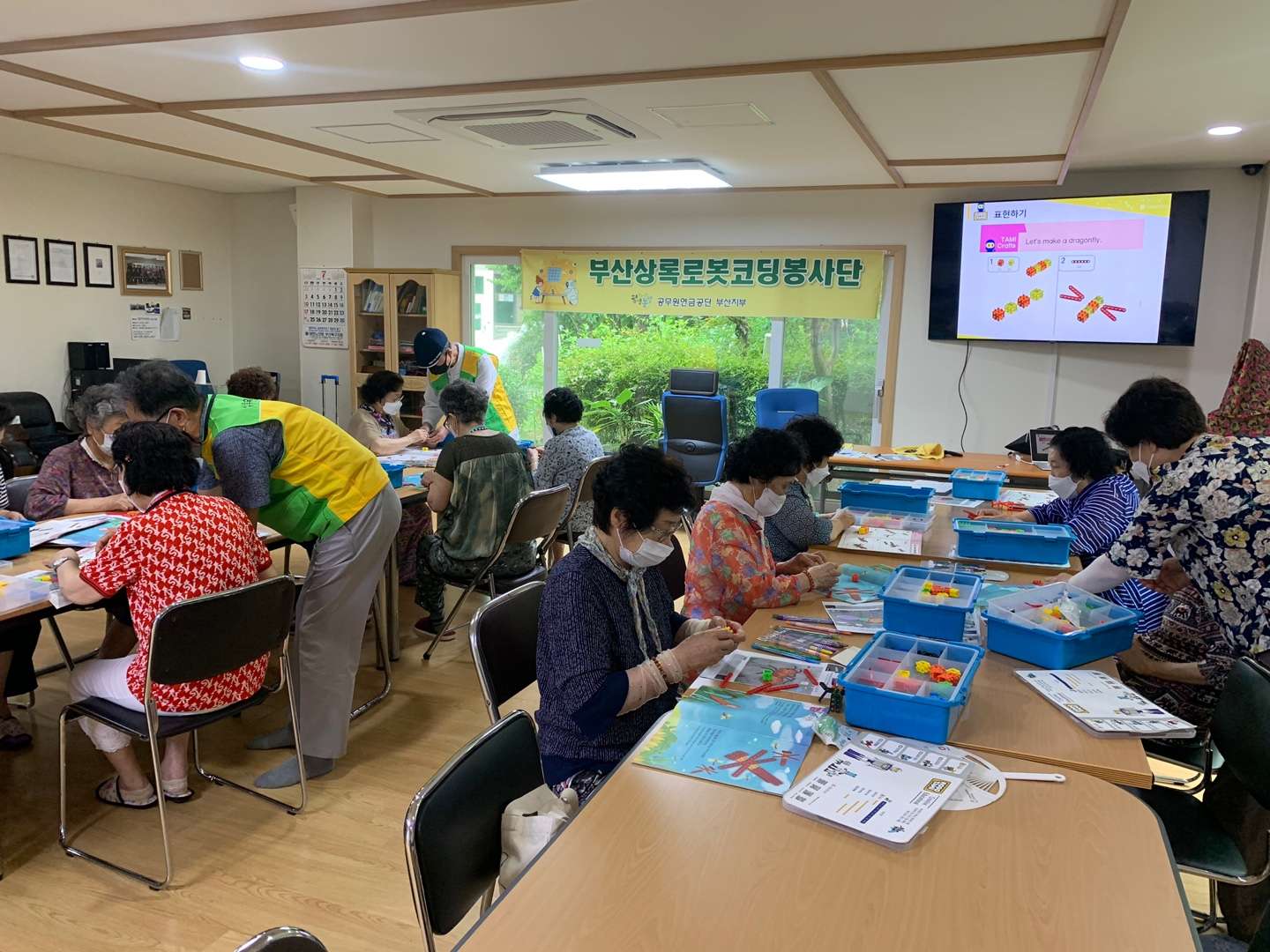 *언제:2022.7.12.(화) 14:00-15:30 *어디서: 부산시 북구 만덕로 276번길 60, 동문굿힐아파트 1단지 경로당 *교육생: 60~70대 어르신들(15명) *자원봉사자: 강효진, 김경숙, 안정호(3명) *활동내용: -부품 알아보기: 큐브, 패널, 굴절판, 다관절(암, 수), 이빨, 브라켓 등 -’나도 날고 싶어요.‘ 이야기를 희망자가 소리내어 크게 읽는다. 읽은 내용으로 질문하고 답한 후 관련된 이야기를 주고 받는다. -잠자리가 날아다니는 모습을 흉내내어 본다. -직접 잠자리를 조립하며 완성한다.