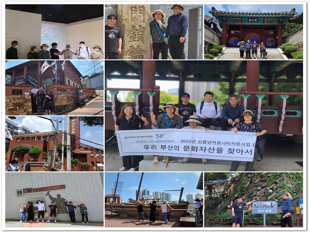 부산광역시 장노년일자리지원센터 노후준비 커뮤니티 지원사업 [ 길동무 자문역(자연, 문화, 역사) ] 1. 활동주제 - 부산광역시 동구 등의 근대문화자산을 둘러보고 이를 타 지역민에게 소개할 수 있는 역량을 확보하고자 함 2. 활동내용 - 영가대, 정공단, 부산진교회, 부산진일신여학교, 안용복기념관, 증산공원, 사빈당 등 둘러보기 - 여러 근대문화자산의 위치 및 내용 등중요사항 파악 - 문화관광해설사로의 기본적 소양 알아보기 3. 활동평가 - 초량왜관 내의 동구에 소재한 여러 근대문화자산을 확인하게 되었음 - 근대문화자산과 부산의 여러 문화자산을 둘러보고 그 문화자산의 구체적인 역사적인 상황과 내용에 대해 알게되었음 - 우리 부산에 듣지도 보지도 못한 다양한 문화자산이 존재하는 것에 놀라움을 표출함 - 동구외에도 다른 구에도 이러한 문화자산이 존재할 것에 놀라며 다음 체험학습이 기다려짐