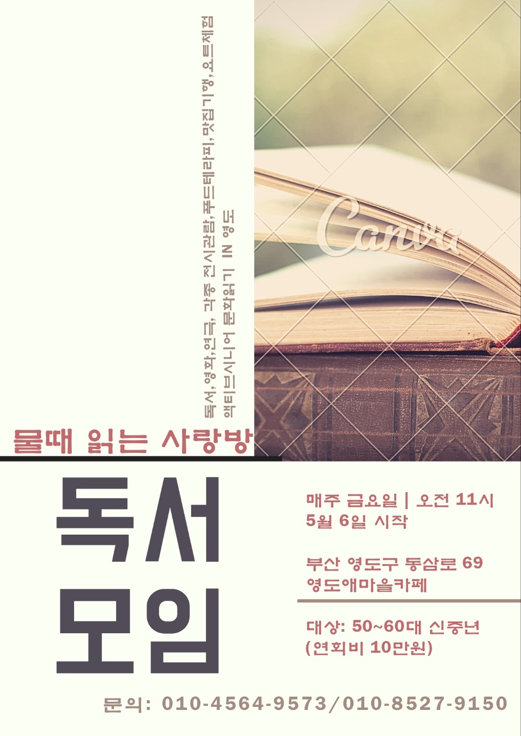 매월 1,3주 금요일 오전 11시에 지정도서를 사전에 읽고 영도구 동삼동 마을카페 <영도애>에 모여 각자의 관점에서 해석하고 자신의 삶과 연계하여 독서토론을 진행한다.