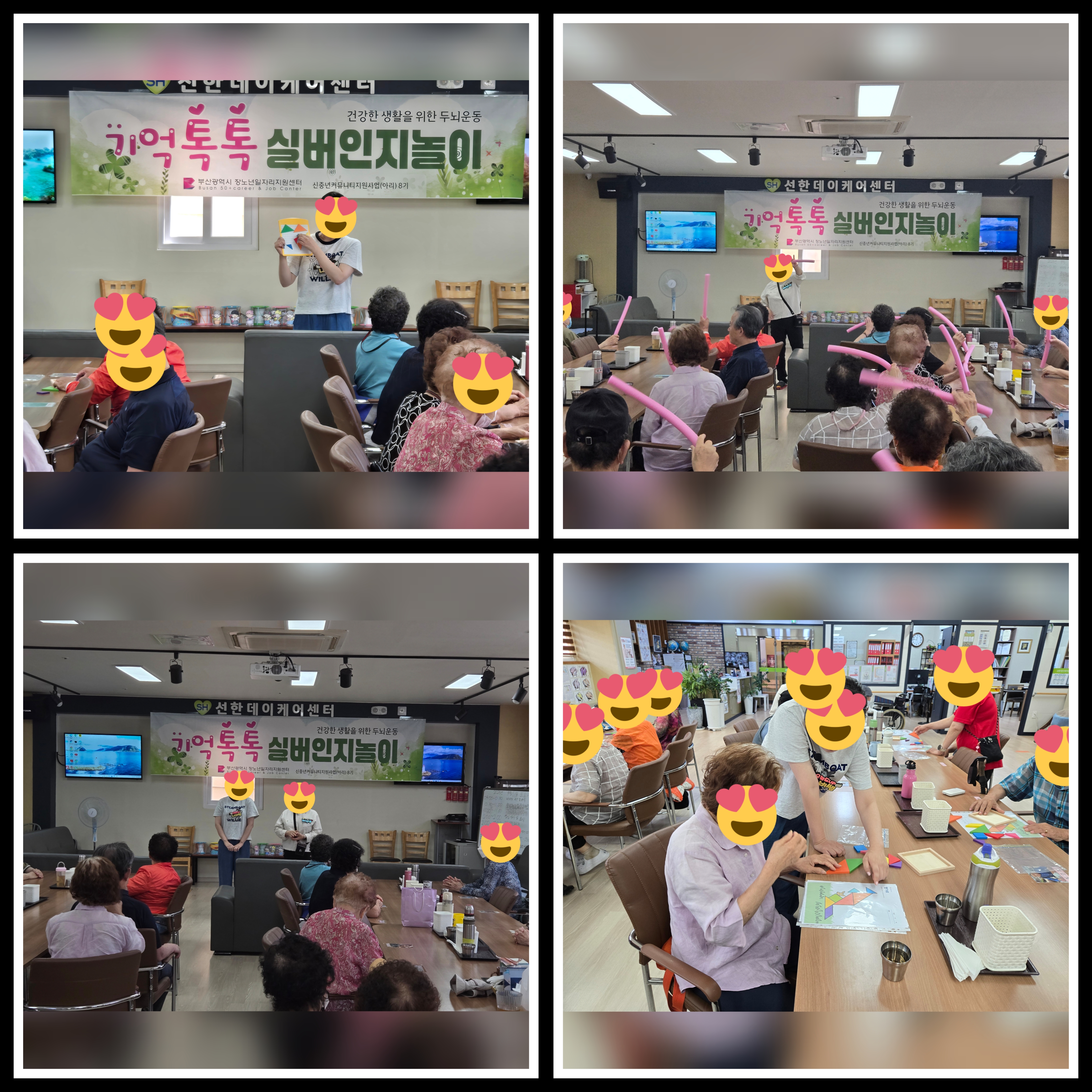 일시 : 2025년 9월 6일(토) 10:50~11:50 장소 : 선한데이케어센터 후원 : 부산광역시 장노년일자리지원센터 주관 : 기억톡톡 실버인지놀이 내용 : 원목 칠교 놀이를 활용하여 촉감, 시각, 인지적 기능을 함께 제공하였습니다. 음악과 율동으로 몸과 마음을 풀고, 칠교 놀이로 사고력과 성취감을 자극한 균형잡힌 프로그램을 진행하였습니다. |