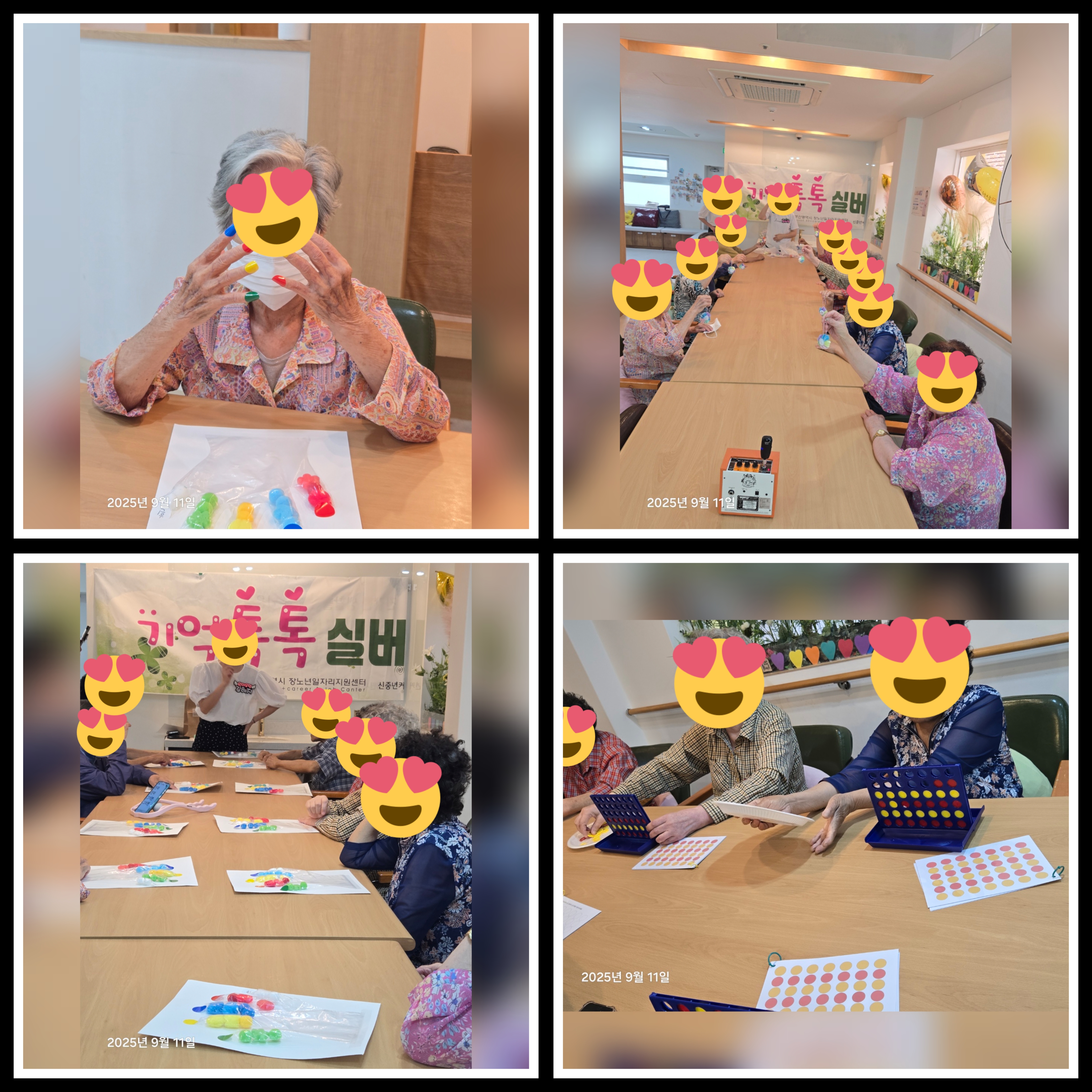 일시 : 2025년 9월 11일(목) 10:30~11:30 장소 : 가고싶은주간보호센터 후원 : 부산광역시 장노년일자리지원센터 주관 : 기억톡톡 실버인지놀이 내용 : 색깔활동, 인지교구 활동, 공예 활동을 조화롭게 구성하여 다양성을 추구하였습니다. 인지, 정서, 사회성, 신체기능을 골고루 자극하는 활동으로 어르신들의 반응이 좋았습니다. |