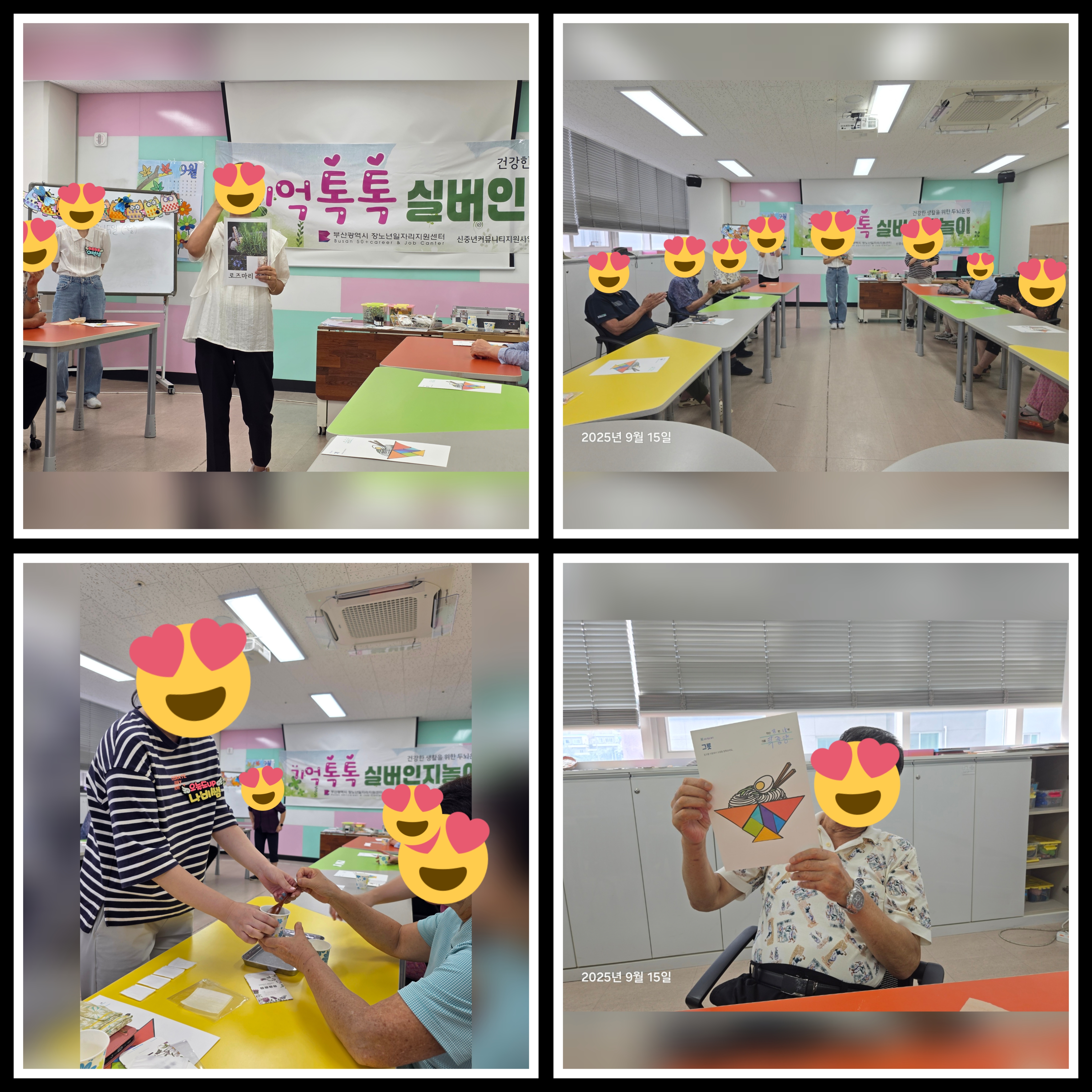 일시 : 2025년 9월 15일(월) 14:40~15:40 장소 : 서구치매안심센터 후원 : 부산광역시 장노년일자리지원센터 주관 : 기억톡톡 실버인지놀이 내용 : 미술활동(칠교)과 감각 자극 활동(아로마)을 병행하여 지루함없이 흥미를 유지하였습니다. 대상자 대부분이 적극적으로 참여하시며, 완성된 작품에 대해 만족감을 표현하셨습니다. |