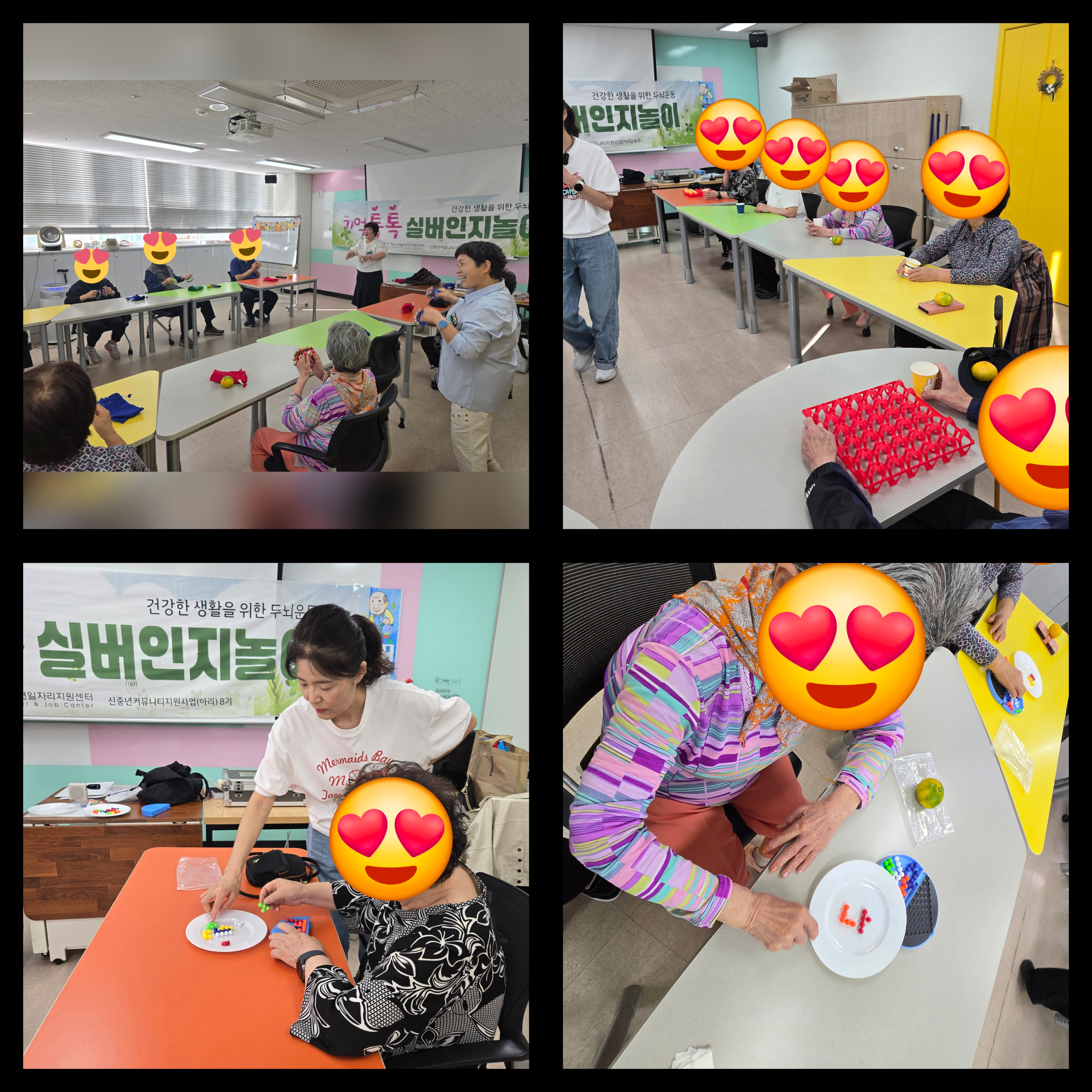 일시 : 2025년 10월 20일(월) 14:40~15:40 장소 : 서구치매안심센터 후원 : 부산광역시 장노년일자리지원센터 주관 : 기억톡톡 실버인지놀이 내용 : 1. 탬버린 손유희            2. 구슬퍼즐 활용                 : 글자만들기, 입체 피라미드만들기, 카드보며 도형맞추기            3. 탁구공 게임                 : 숟가락, 젓가락, 종이컵 등을 활용하여 탁구공을 옮기기 음악에 맞추어 탬버린을 치며 간단한 동작을 함께 함으로써 음악을 통한 정서적 안정 및 기분 전환이 이뤄졌습니다. &ampnbsp구슬을 조합하여 주어진 글자와 모양을 완성하는 활동으로는 시각적 주의력과 공간지각 능력을 자극하고 글자 인식을 통한 언어적 인지자극도 함께 이뤄졌습니다. 탁구공 옮기기 신체활동을 통해서는 손의 섬세한 조절력(소근육 운동)및 집중력 향상, 참여자 간 응원과 웃음으로 사회적 교류 및 정서적 활력이 증진되었습니다.