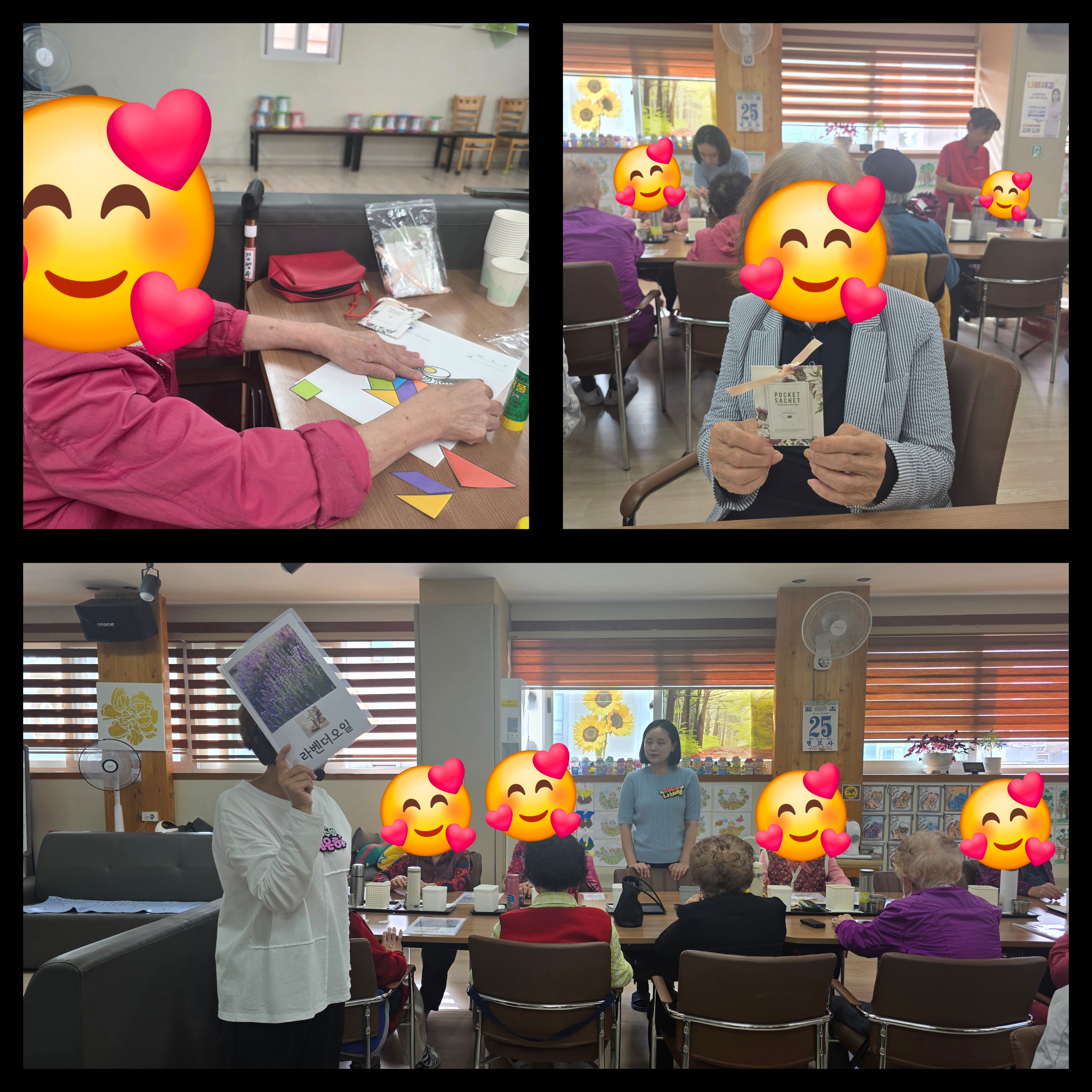 일시 : 2025년 10월 25일(토) 10:50~11:50 장소 : 선한데이케어센터 후원 : 부산광역시 장노년일자리지원센터 주관 : 기억톡톡 실버인지놀이 내용 : 1. 아로마 향기               : 향기를 통한 회상활동, 나만의 아로마 방향제 만들기, 라벤더 아로마 오일로 손마사지 해보기            2. 칠교수업               : 칠교도형 가위로 오리기, 칠교 도형안에 같은 모양 찾아 붙이기 아로마 향기 수업과 칠교 수업이 정서.인지.신체 영역을 균형있게 자극, 대상자의 수준과 흥미에 맞게 구성되었습니다. 대부분의 어르신들이 적극적으로 참여하여 몰입도가 높았습니다. "향기가 너무 좋았습니다.", "퍼즐을 완성하니 뿌듯하다." 는 말씀을 하시며 밝은 표정을 보이셨습니다.