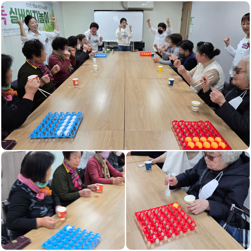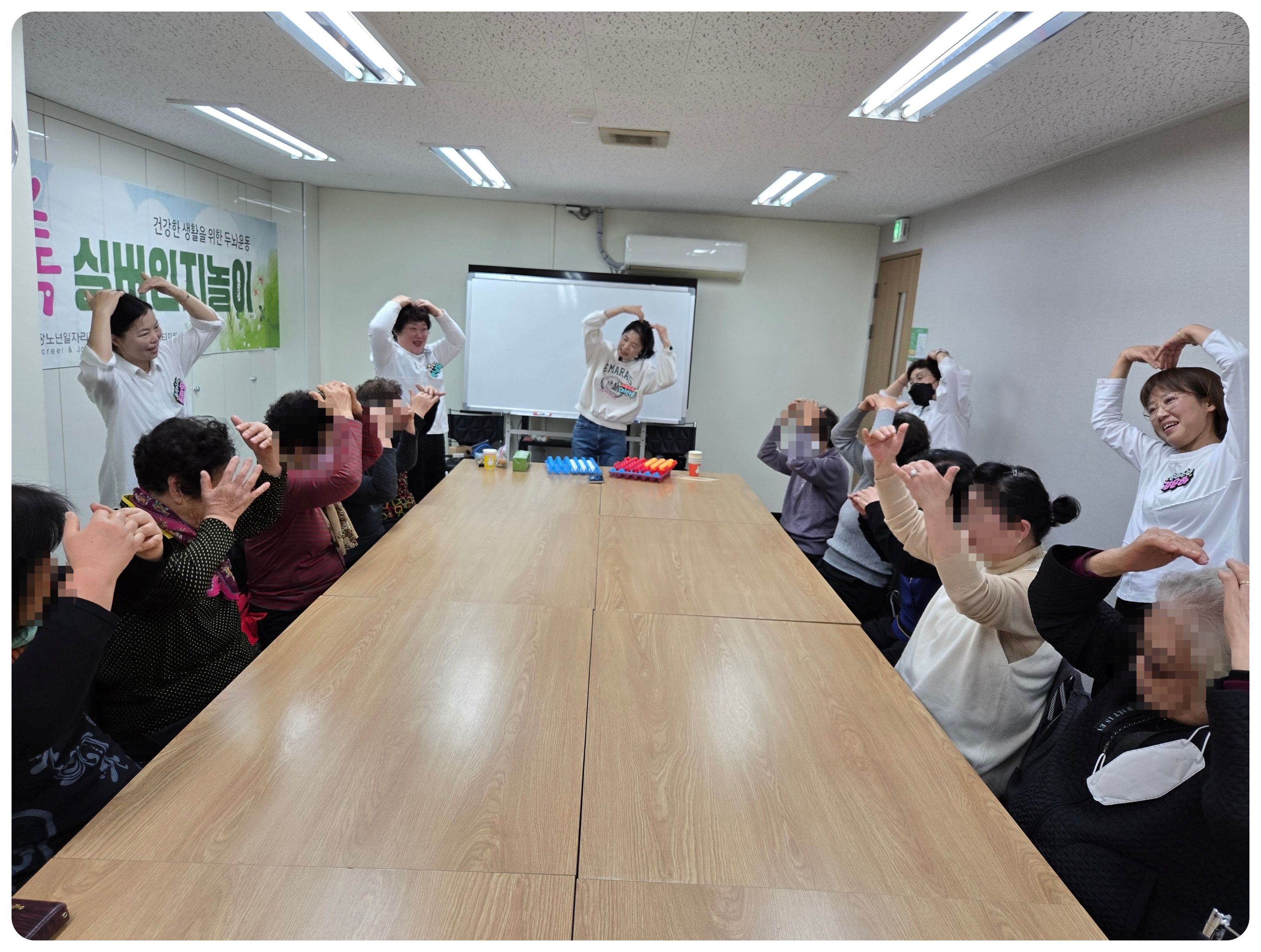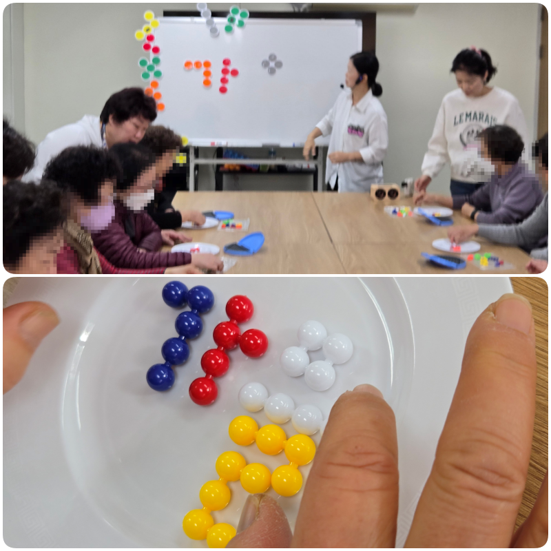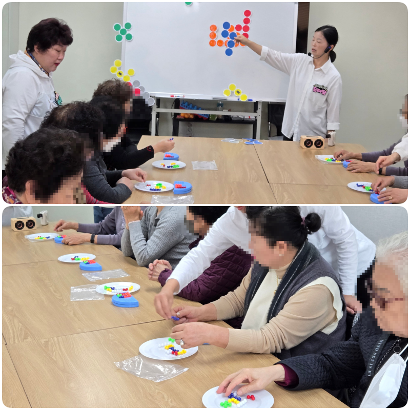 일시 : 2025년 11월 27일(목) 10:00~11:00 장소 : 어진샘노인종합복지관 후원 : 부산광역시 장노년일자리지원센터 주관 : 기억톡톡실버인지놀이 내용 : 1. 구슬퍼즐 인지활동                 구슬의 모양, 색깔 분류하기 > 글자 만들어 보기(한 글자, 두 글자) > 입체 피라미드 만들기 > 카드보며 도형 맞추기             2. 탁구공을 활용한 신체활동                 탁구공 수수께끼 게임 > 탁구공 탐색 >탁구공 옮기기 게임 진행(종이컵, 숟가락, 젓가락 등 옮기는 도구 변화) 이번 활동은 어진샘노인종합복지관의 요청으로 진행된 2회차 중 두번 째 시간이었습니다. 구슬퍼즐 인지활동과 협동.순발력 중심의 탁구공 옮기기 게임으로 구성되었으며, 어르신들의 인지자극, 소근육 협응력 향상, 사회적 상호작용 증진에 긍정적인 효과가 있었습니다. 구슬퍼즐 활동에서는 색깔 분류, 카드 매칭, 퍼즐 완성 과정을 통해 집중력과 성취감을 느낄 수 있었으며, 특히 완성 후 "내가 했네!"라고 말씀하시며 자신감과 만족감을 표현하시는 모습이 인상적이었습니다. 이어 진행된 탁구공 게임에서는 팀을 이루어 참여하며 협동심과 운동의 즐거움을 경험하셨습니다.  "천천히, 괜찮아!"라고 서로 응원해 주시며 정서적 교류가 나타나는 모습을 확인할 수 있었습니다. 활동이 끝난 후 어르신들께서는 "다음 주에도 오나?", "오늘 정말 재미있었다!" 며 아쉬움을 표현해주셨습니다. 오늘이 마지막 시간이었지만 "내년에 기회가 된다면 다시 뵙고 싶다." 고 인사드리며 따뜻하게 활동을 마무리할 수 있었습니다.
