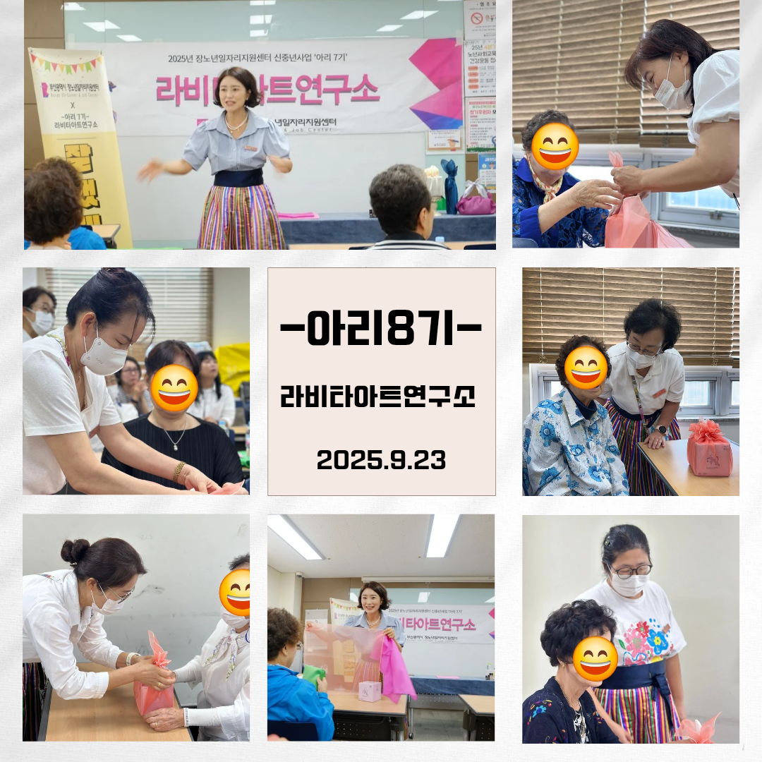 9월 23일&nbsp- 중구노인복지관(분관) &nbsp 행사명:&nbsp마음을 감싸는 보자기아트(오감체험 프로그램) 일시:&nbsp2025년&nbsp9월23일(화) 10:00 주관:&nbsp아리8기&nbsp라비타아트연구소 연구원:&nbsp엄보영,우현옥,이영희,김옥화,구혜영,윤경숙,정혜원(7명) 이번 프로그램은 오감체험형 보자기아트 수업으로 진행되었습니다.