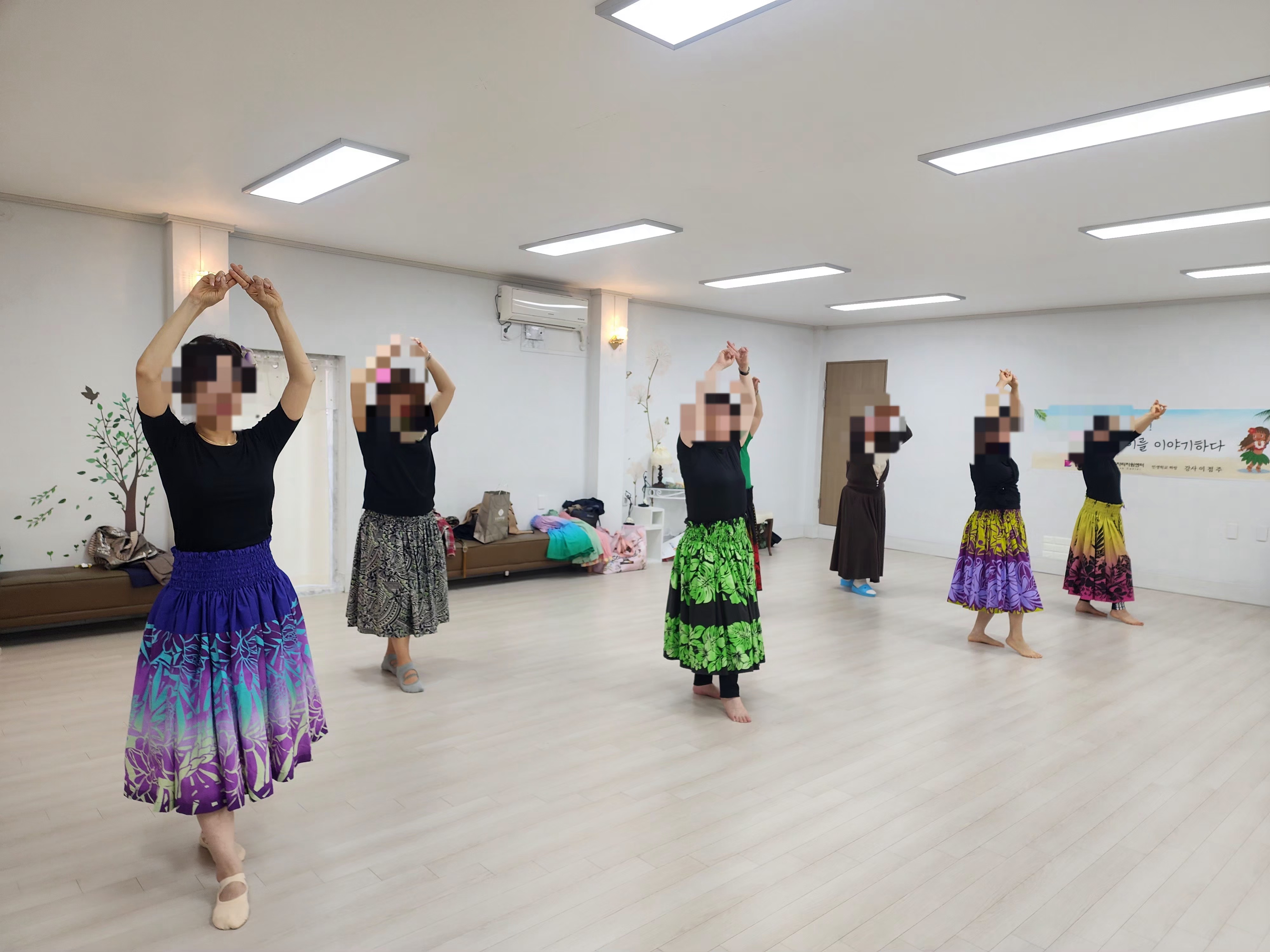 하와이훌라댄스 4차시.. 처음으로 합류한 분이 있어서 한번 더 수강생분들의 소개롤 하고 스트레칭으로 몸을 충분히 풀고 처음으로 참석하신 분을 위해 마무리된 pearly shells 작품을 다시 한번 지도를 했는데 처음 참석하신 분이 동영상을 익혀 온 덕분에 염려와 달리 수월하게 해결할 수 있었습니다. 숨 돌리는 시간 겸 3차시 수업을 하는 동안 각자 느꼈던 점을 듣는 시간과 건강을 위해 시작한 훌라댄스를 통해 일자리까지 갖게 된 나의 이야기를 짧게 들려주었고 남은 시간 두번째 작품인 '하와이 연정' 동작을 지도하기 시작했습니다. 첫 작품과는 달리 좀더 쉽게 받아들이며 진심 즐겁게 춤을 배우는 수강생들을 보며 하와이 훌라댄스는 남녀노소 누구나 무리없이 할 수있는 운동이기에 더욱 더 추천드리고 싶은 운동입니다,