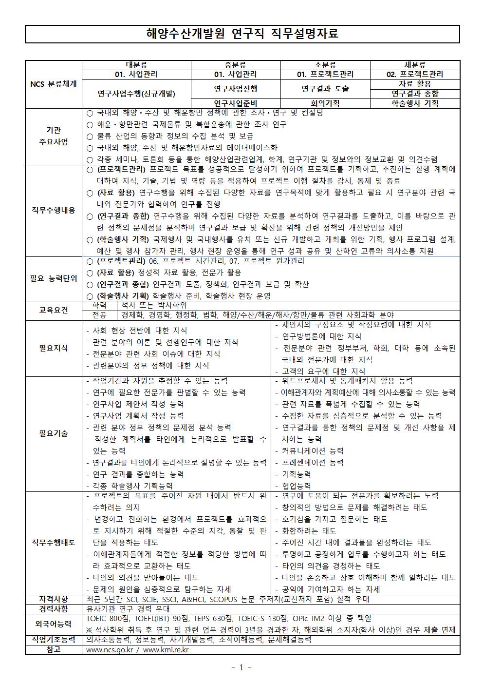 · 채용분야의 세부 직무 내용은 NCS기반 직무설명자료(연구직)를 참고해 주시기 바랍니다.