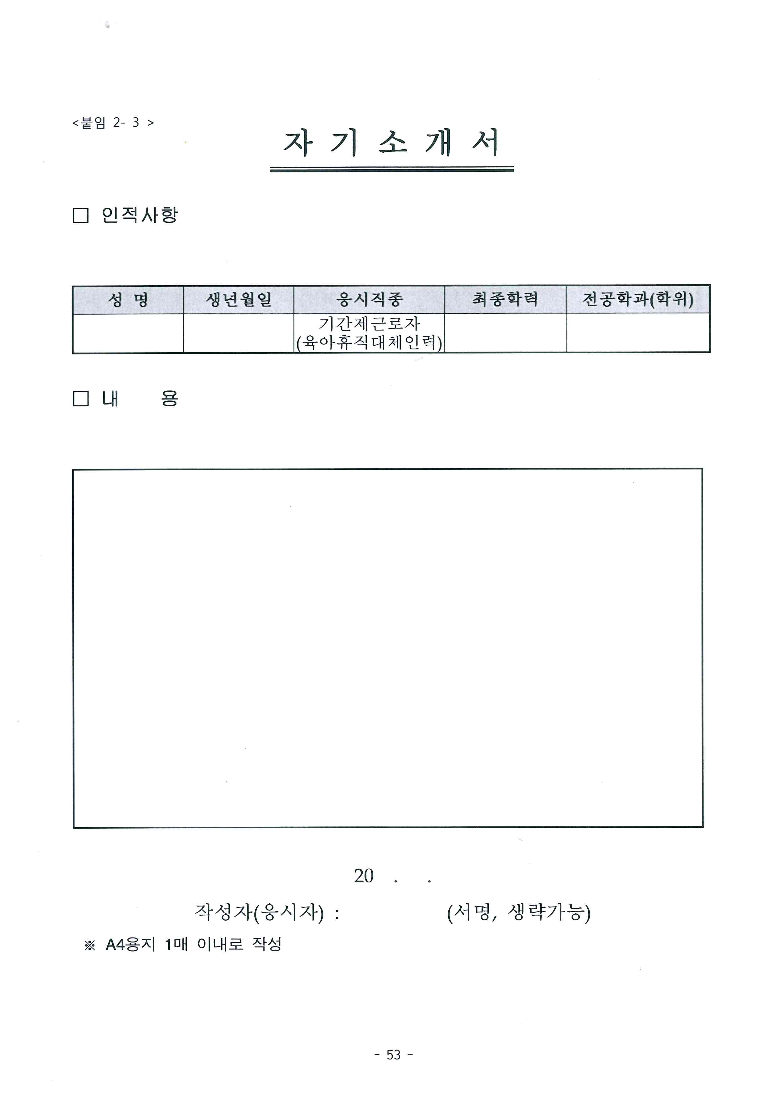첨부파일 다운로드 2018교통행정과 기간제 근로자 채용 자기소개서.jpg 첨부파일 다운로드 2018교통행정과 기간제 근로자 채용공고.hwp 첨부파일 다운로드 |