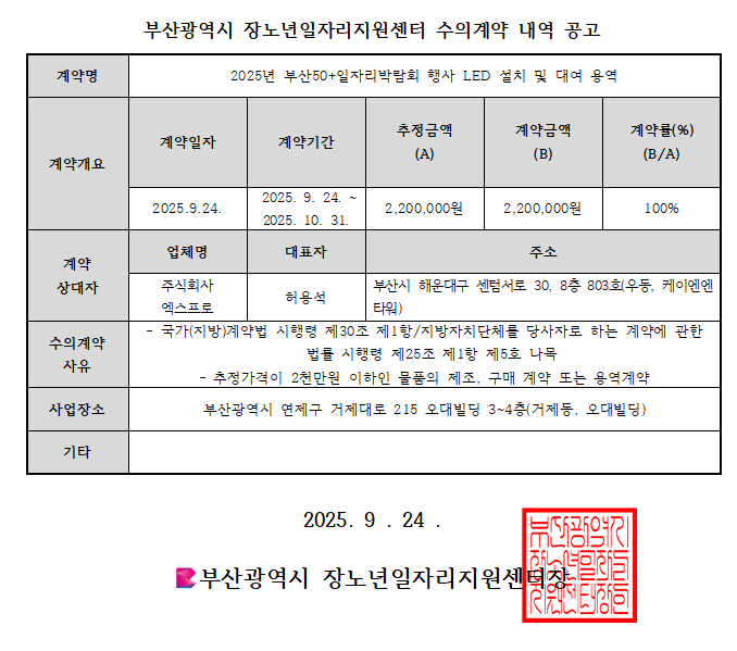 부산광역시 장노년일자리지원센터 수의계약 내역 공고