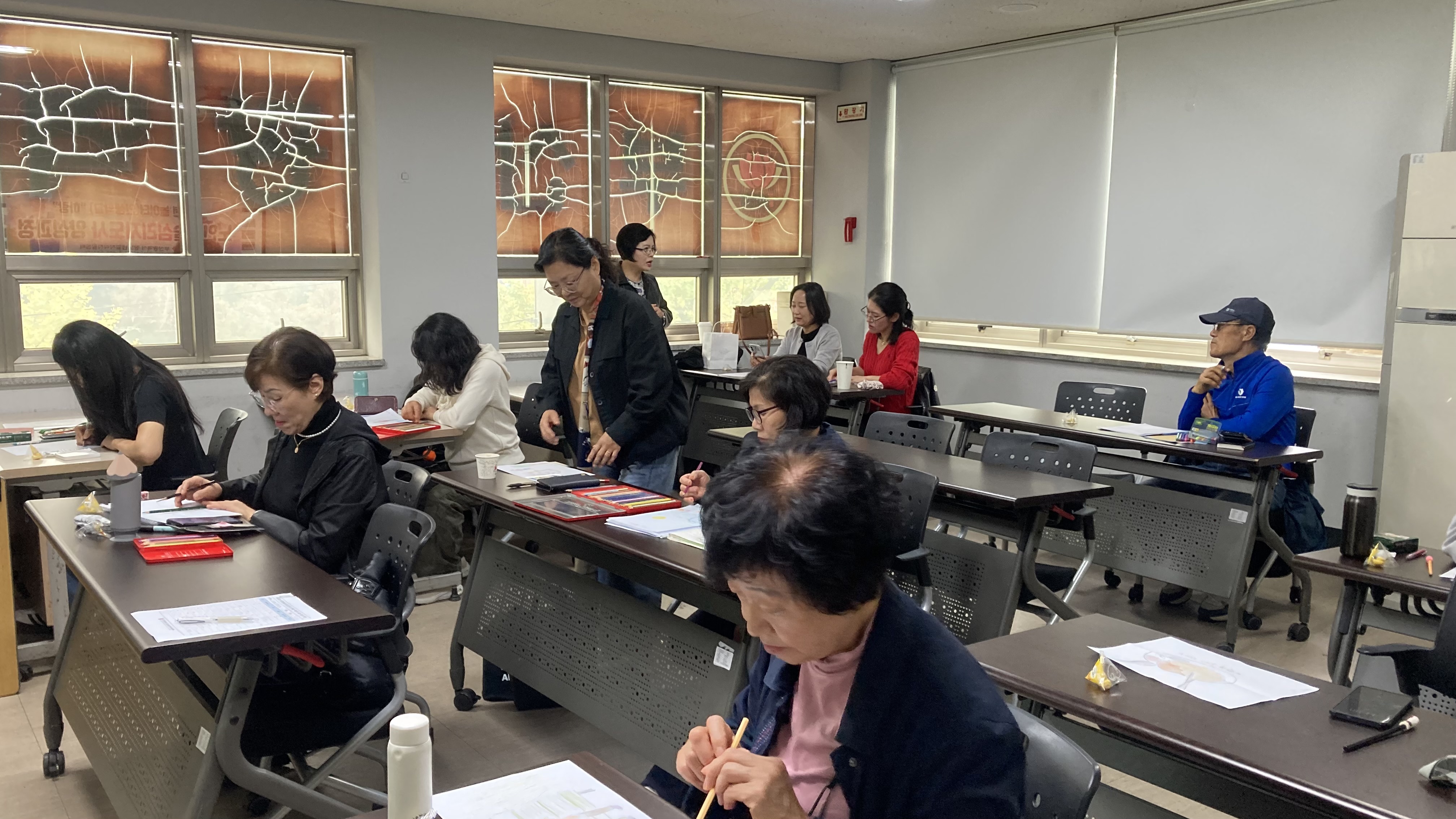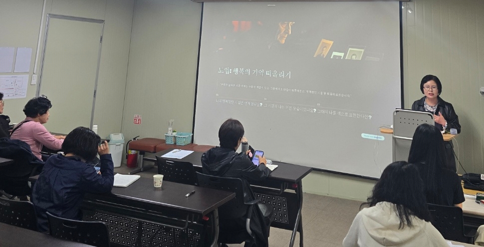 강의목표: 내 삶의 중요했던 삶의 여정에 대한 통합적 이해돕기, 영상프로그램응용법에 대한 탐색돕기 강의주제: 행복했던시절(감정,가치,행위카드활용). 프로그램영상작업복습&ampnbsp 노인미술치료프로그램을 영상에 융합하여 작업한 지난 수업에 대해 결석자와 질문들이 많아 다시 한번복습한후&ampnbsp 녹화분을 수강분들에게 전달을 해드렸더니 &ampnbsp상당한 반응효과가 있었답니다^^. &ampnbsp행복했던 시절의 이미지를 직접 그려서 그림카드를 접목하여 그림에서 부족했던 것을&ampnbsp 마음을읽는 그림카드를 통해 무의식적 반응과 욕구를 카드에서 드러나는것에 대해 신기해 하는 반응과&ampnbsp &ampnbsp대체로 행복했던 시절의 기억대가 나이가 많은 분일수록 1970년대를 들었고 젊은 분들일수록 20대의 기억,&ampnbsp 남편과 결혼하기전 연애했을 때의 설램을 가졌던 시기,&ampnbsp 그중 두 분은 현재가 가장 행복한 순간이라는 것이 투사되었다고 봅니다. ^^ 이렇듯 행복했던 순간들을 그림으로 표현하고 이를 함께 이야기하는과정은&ampnbsp 심리적회복과 치료적 경혐이 됩니다.&ampnbsp 과거의 긍정적 기억을 시각적으로&ampnbsp재현함으로써 노인은 자신의 삶을 의미있게 회상하고 잊혀진 자존감과 성취감을 되찾게 되며&ampnbsp 노인들에게는 이런 프로그램을 매개로 사회적 교류와 정서적 지지를 강화하고 공감과 유대감에 도움을 줄수있답니다~~^^