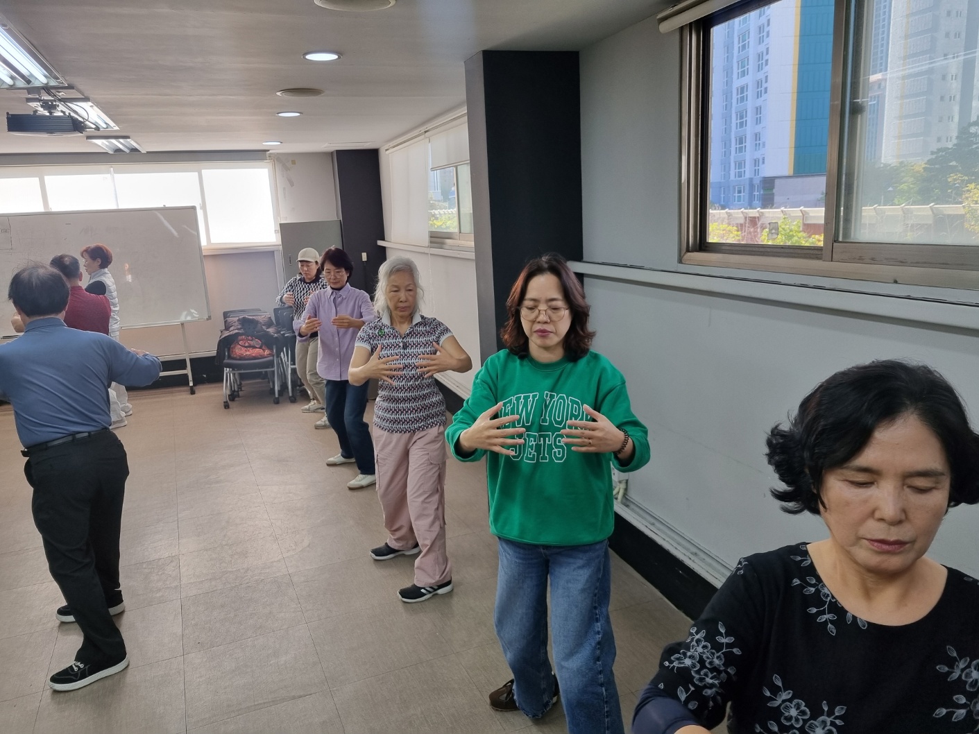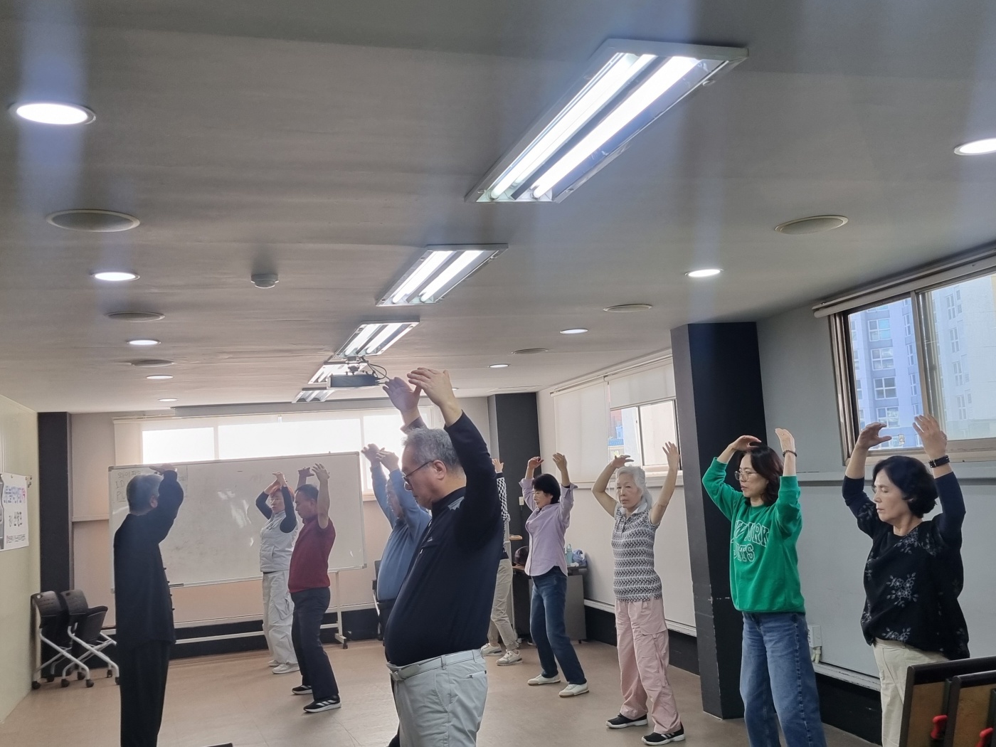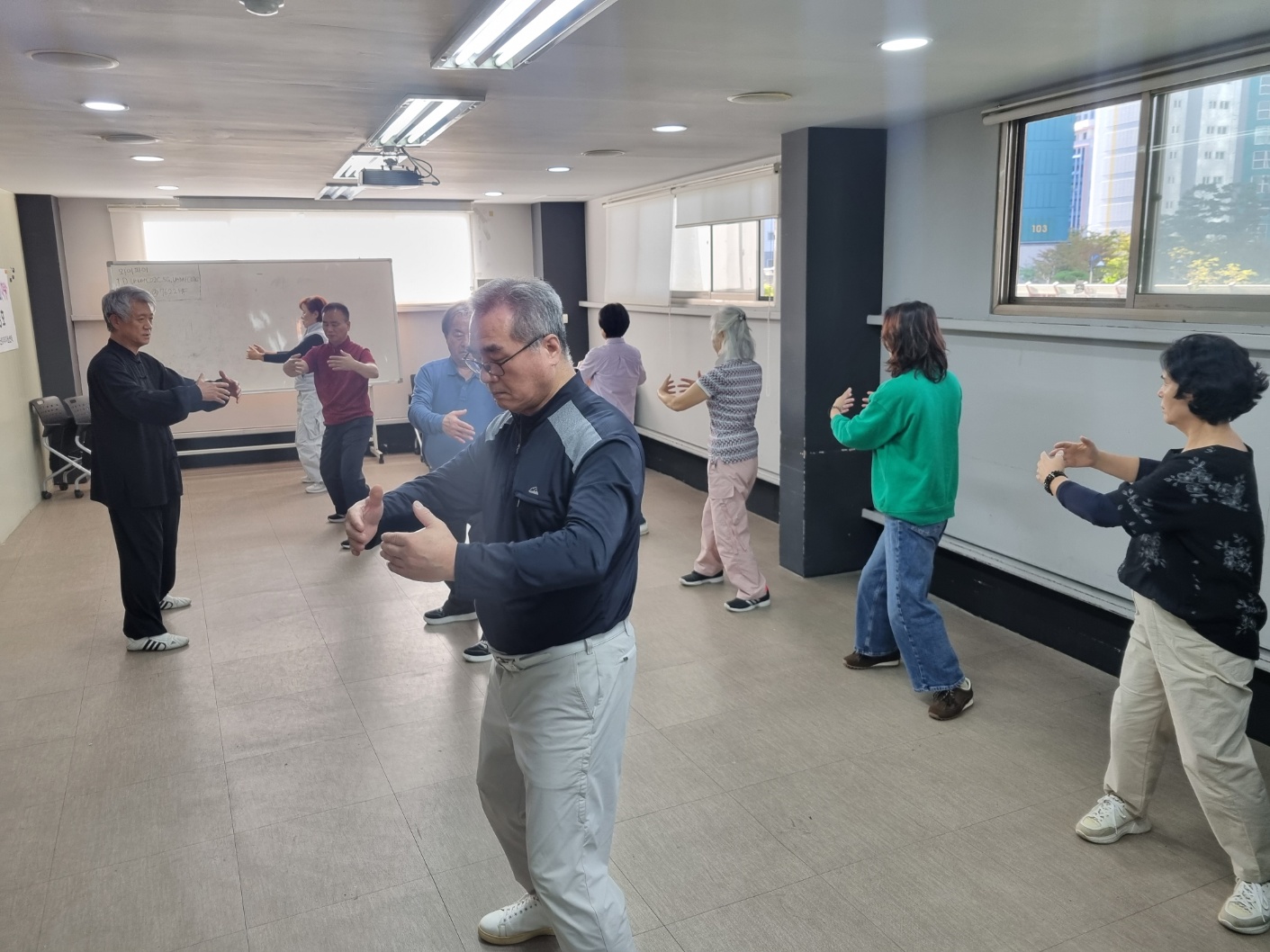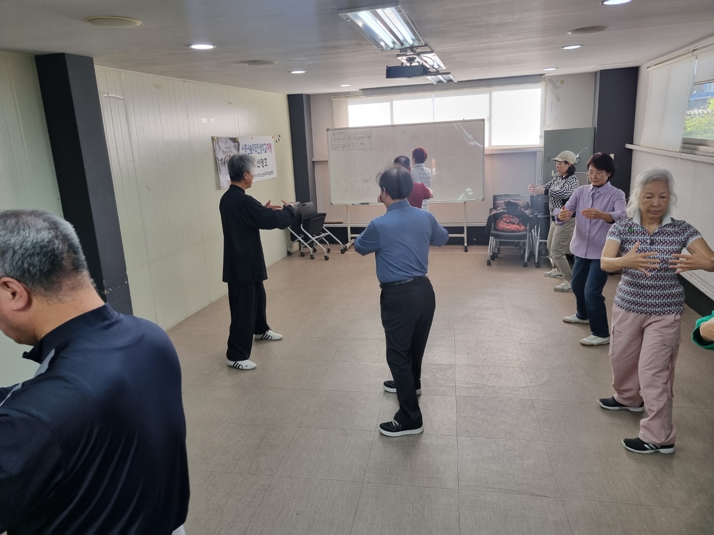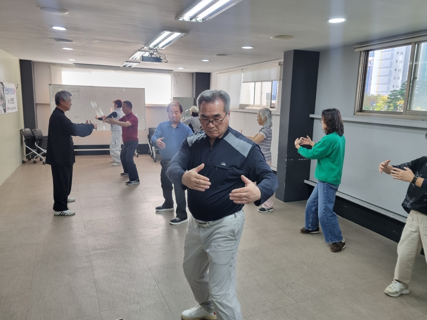 지난 시간에 이어 8법5보를 익히는 시간을 가졌습니다. 지난 시간에 결석하신분들은 오늘 일찍와서 따로 기본을 익혔습니다. 1교시는 기공10식과 5보참장공을 위주로 하고 3교시에 8법5보를 수련했습니다. 오늘은 한분이 빠지고 열분이 모두 참석을 했습니다. 다들 참 잘 따라해 주셔서 놀라웠습니다. 기본동작을 잘 익히는 것이 중요합니다. 몸에 배이면 교정하기가 힘드는게 운동입니다. 처음이 중요합니다. 한분한분 자세를 잡아주려 애를 썼습니다. 태극권은 깊은 호흡과 단전에서 나오는 기를 바탕으로 몸과 마음을 움직이는 운동입니다. 근골격은 물론이거니와 심폐기능과 심혈관계가 모두 강화되는 걸 체험할 수 있습니다. 기회가 닿으면 꼭 태극권과 태극명상을 수련해 보시기를 권합니다.