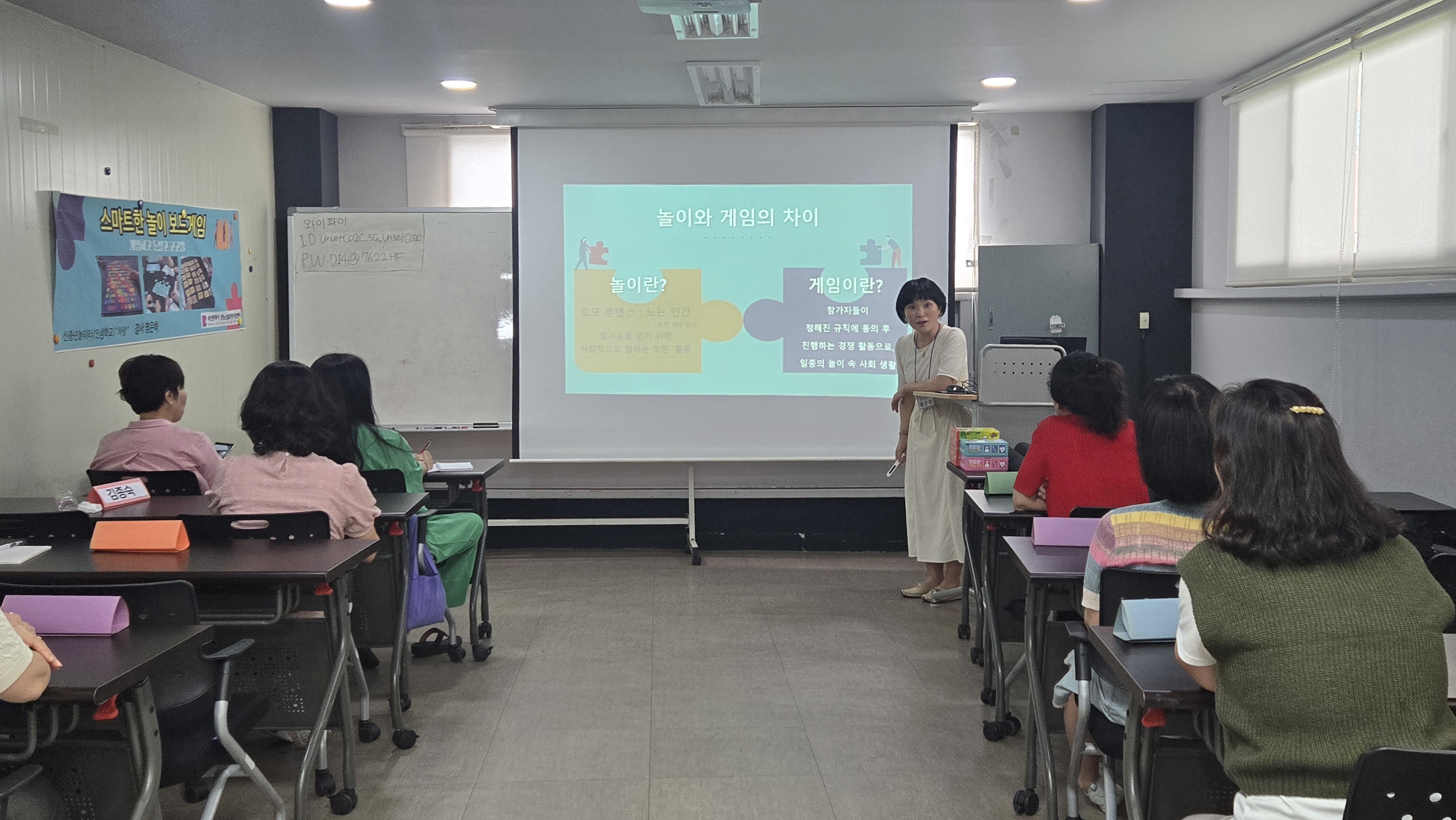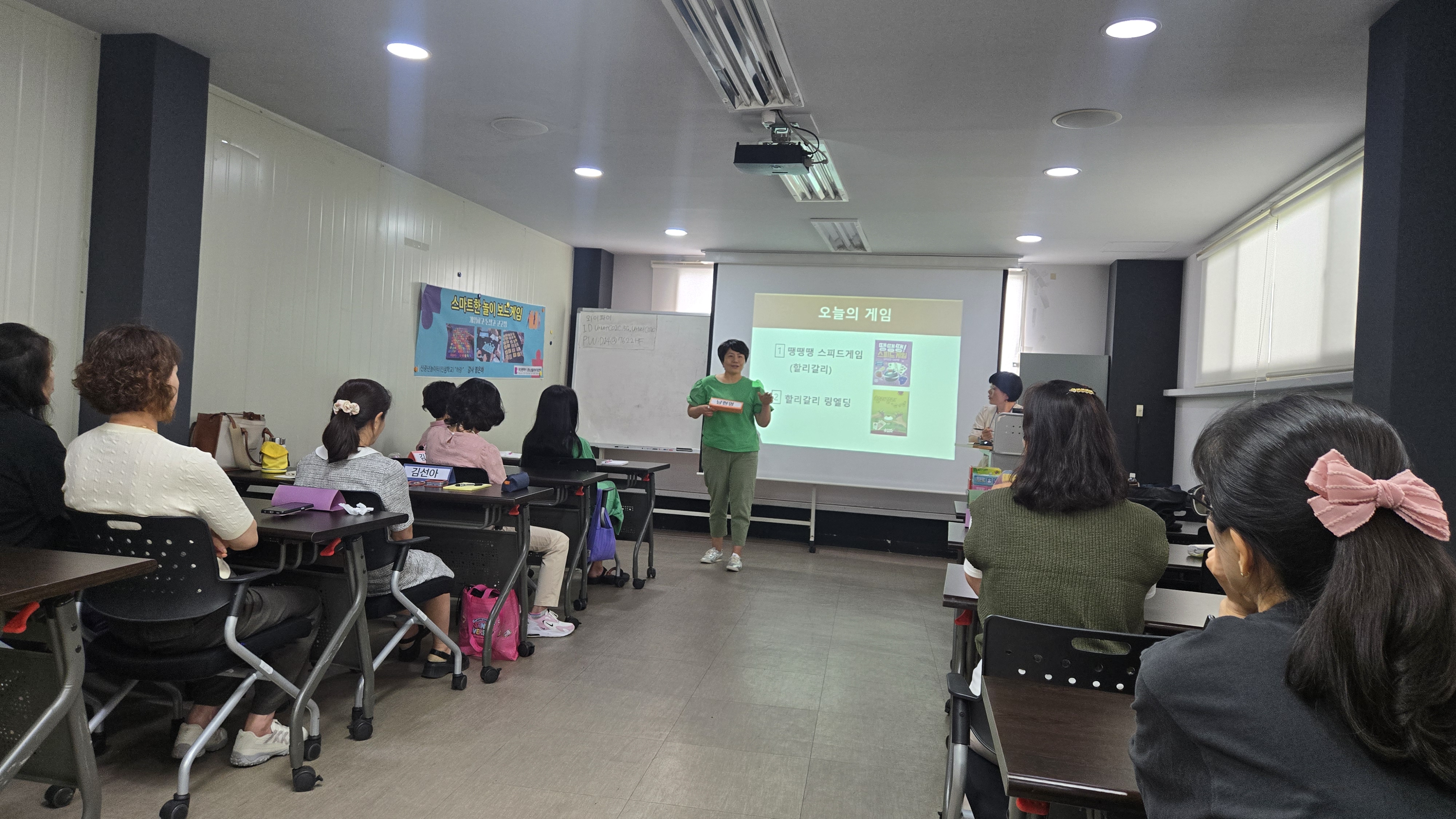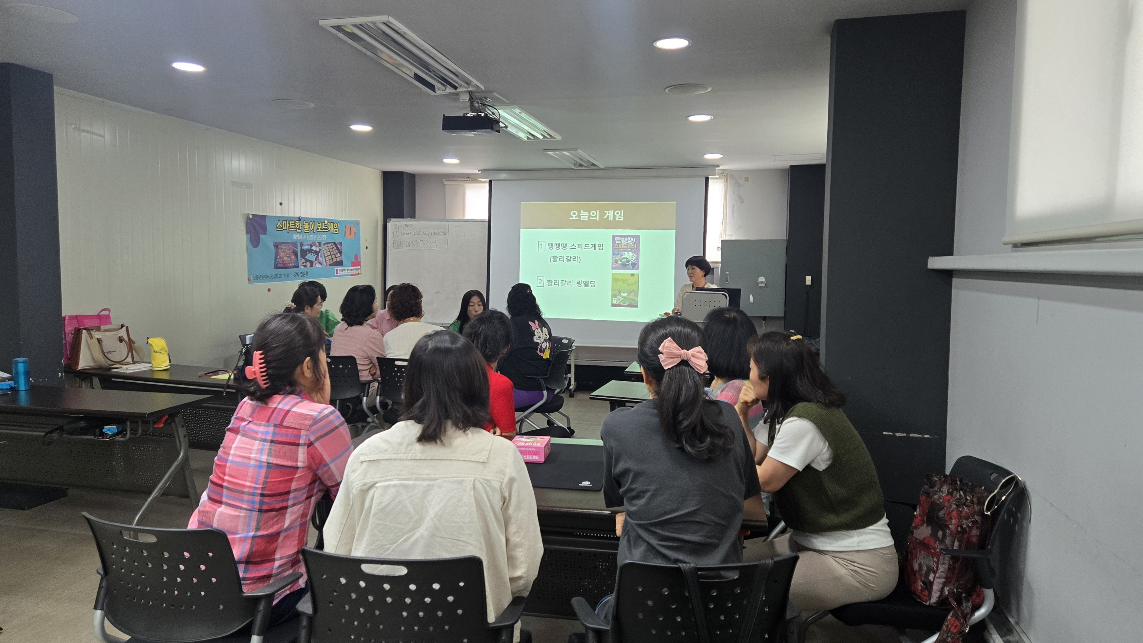 오늘은 기다리고 기다리던 「스마트한 놀이 보드게임 – 실버보드게임 자격증반」의 1차시 수업이 시작되었습니다! 총 15명 등록 중 결석 문자 주신 2명 외에 13명의 수강생이 함께 자리해주셨습니다.   첫 수업답게 가볍게 즐길 수 있는 독일 보드게임 "할리갈리"를 했습니다. 총 10차시로 진행되며, 다양한 보드게임을 배우고,  실버보드게임 자격증 취득까지 연결됩니다. |